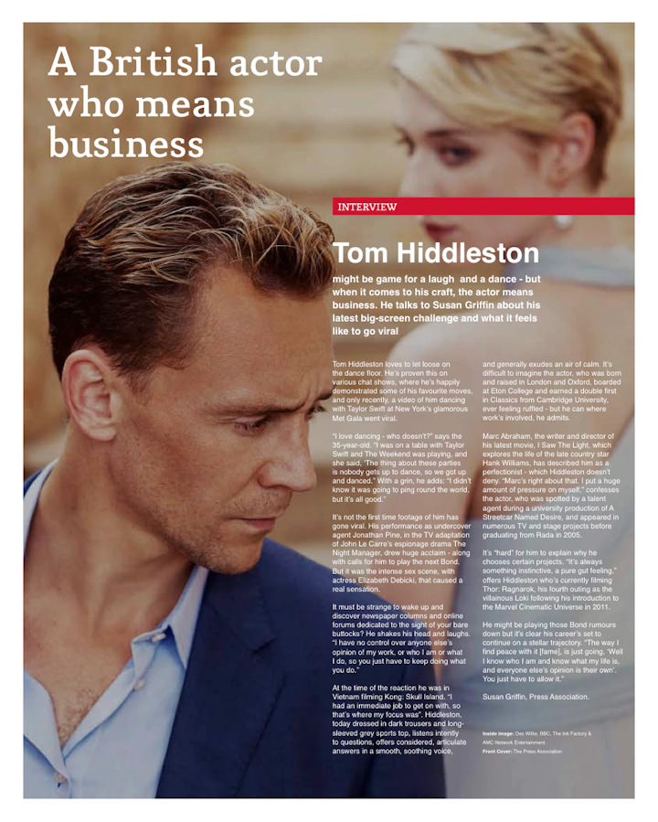 The concept was to make the newspaper more of a magazine feel with a strong celebrity image on the front with an interview in the centrefold. This would influence recipients to open the newspaper as soon as they received it. Tom Hiddleston was man of the hour following his release of the TV drama ‘The Night Manager’.